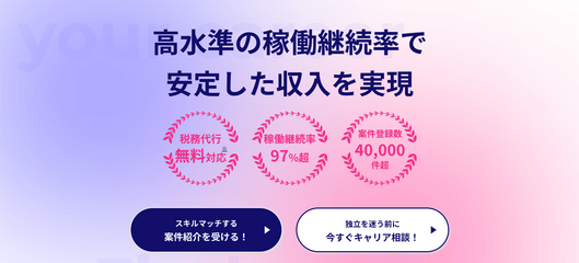 案件探しはもちろんのこと、独立に向けた開業手続き・税務面・現場での不安などに至るまで、何でも相談できる体制が整っているのが特徴のフリーランスエージェントです。