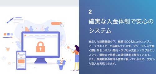 安定した財務基盤の下、総勢1000名以上のエンジニア・クリエイターが活躍しています。フリーランスで働く際に気をつけたい契約トラブルや支払いトラブルのリスクを、極限まで排除した運営体制を整えています。
