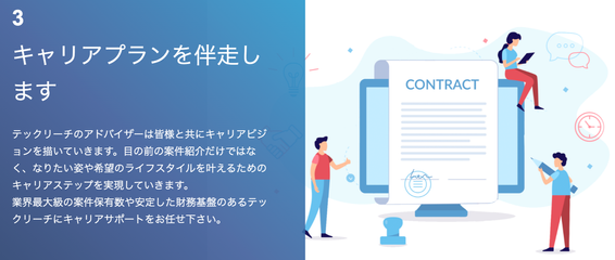 テックリーチは、株式会社アールストーンの運営するITエンジニア、クリエイター(フリーランス)専門の案件マッチングサービスです。専任のコンサルタントがフリーランスとクライアントの間に立ち、マッチングのサポートを行います。フリーランス一人一人ののスキルや経験、志向に合わせた案件を提案し、クライアントとの契約や交渉を代行してくれるところが特徴です。