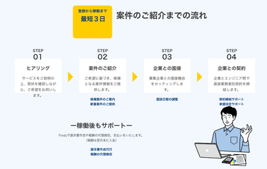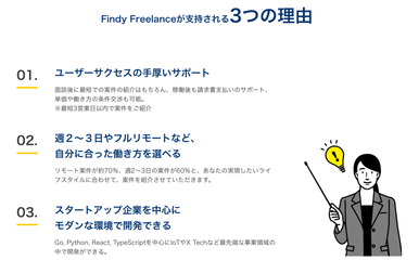 Findy Freelance(ファインディフリーランス)は、ファインディ株式会社が運営するIT・Web系フリーランスエンジニアに強みをもったフリーランスエージェントです。