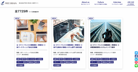 FREE BRAINの特徴として、幅広い案件をご紹介可能です。案件の取扱いPG・SE・PMOからコンサル、ヘルプデスク、WEBデザイナーなど幅広い職種にて、月間で数千件ほど紹介が可能になっています。