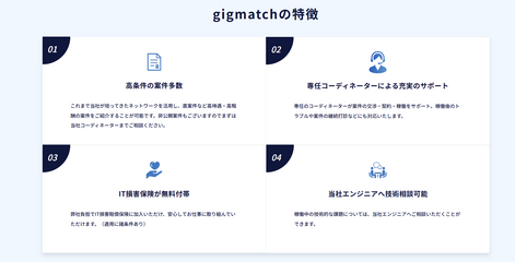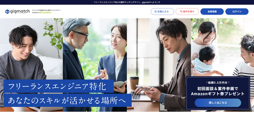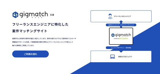 Gigmatchは、ITフリーランスのエンジニアやデザイナーを専門とするエージェントサービスです。高単価なエンド直請け案件やフルリモート案件、