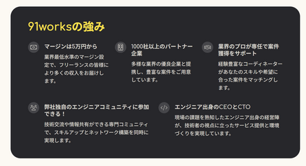 「91works」は、IT/Web業界で活躍するフリーランスエンジニアを専門としたエージェントサービスです。最大の特徴として「91%の徹底サポート」を掲げており、これはフリーランス活動における案件紹介以外の業務、例えばキャリア相談、単価交渉、契約・請求関連の事務手続き、参画後のフォローアップなど、全体の91%に相当する領域を代行・支援することを意味します。これにより、エンジニアは本来の専門業務である開発に集中できる環境を手に入れることができます。