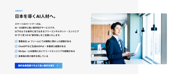 公開されている情報によると、紹介案件の平均単価は95万円と非常に高く、リモート可能な案件が80%以上を占めるなど、好条件の案件を豊富に保有しています。これは、AI・DX分野に精通した専任コンサルタントが、フリーランス一人ひとりのスキルやキャリアプランを深く理解し、企業のニーズと的確にマッチングさせることで実現されています。