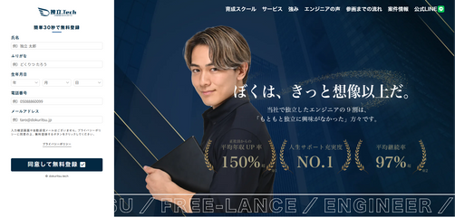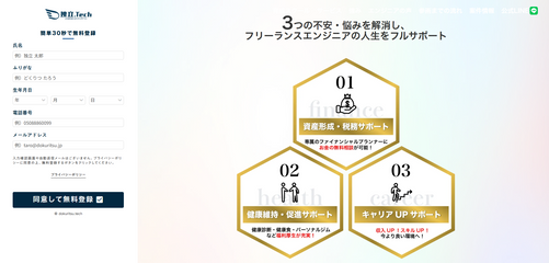 独立テックは、ITフリーランスエンジニア向けに特化したエージェントサービスで、「お金」「健康」「キャリア」の3大不安を解消することを目的としたフルサポート型の支援体制を提供しています。常時15,000件以上の案件を保有し、70%以上がリモート対応可能。案件紹介だけでなく、ファイナンシャルプランナーによる無料相談、税理士による確定申告代行、法人化支援、健康診断の割引、パーソナルトレーニングの無料提供など、生活全体を支えるサービスが充実しています。初めての独立でも安心できるよう、開業サポートや面接対策、キャリア相談も用意されており、エンジニアが安心してフリーランスとしてのキャリアを築けるよう設計されています。登録から案件参画、アフターサポートまで一貫して支援する体制が整っており、正社員を超える働き方を目指す人に最適なサービスです。