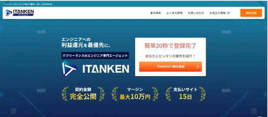 「ITANKEN」は、IT分野で活動するフリーランスのエンジニア、デザイナー、マーケターなどを専門とするエージェントサービスです。一番の強みは、業界でもトップクラスの低いマージン率(10%〜)を公開している透明性と、報酬が案件終了の翌月15日に支払われる迅速な支払いサイトです。これにより、フリーランスは自身のスキルに見合った高い報酬を、安定したキャッシュフローで得ることが可能になります。