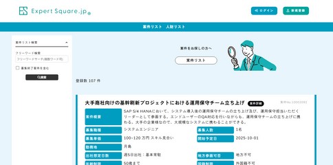 「Expert Square.jp®」は、コンサルティングファームであるギャラントパートナーズ株式会社が運営する、フリーランスのコンサルタントおよびITエンジニア向けの案件紹介サービスです。
