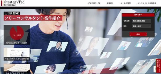 ストラテジーテックフリーランスは、株式会社ストラテジーテック・コンサルティングが運営する、戦略・ITコンサルタント向けの案件紹介サービスです。月額150万円以上の高単価案件を多数保有し、92%以上がリモート対応。DX・AI・PMOなど最先端領域のプロジェクトも豊富で、専任コンサルタントが登録から参画までを徹底サポート。副業やフルタイムなど多様な働き方に対応し、キャリアアップを支援します。