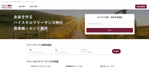 「フォーカスフリーランス」は、ハイスキルなITフリーランスに特化したエージェントサービスです。特に「高単価×エンド案件」を強みとしており、自身のスキルを活かして高収入を目指すエンジニアを主なターゲットとしています。
