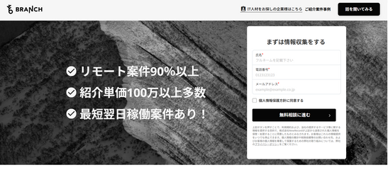 BRANCH」は、ITフリーランス向けの専門エージェントサービスです。最大の特徴として「リモート案件90%以上」「紹介単価100万円以上多数」「最短翌日稼働案件あり」という3点を掲げており、柔軟な働き方と高収入を両立させたいフリーランスを強力にサポートします。