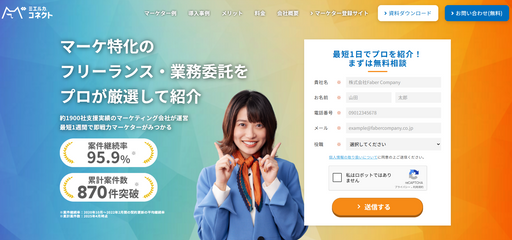 「ミエルカコネクト」は、マーケティング分野に特化したフリーランス・業務委託のマッチングサービスです。約20年間で1900社以上の支援実績を持つWebマーケティング会社が運営しており、その知見を活かしてプロのマーケターを厳選して紹介します。