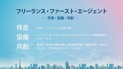 『フリーランス・ファースト・エージェント~伴走・協働・共創~』をコアバリューに掲げ、フリーランスと共に新しい働き方(新しい価値)を作り、世の中のスタンダードにしていきます。