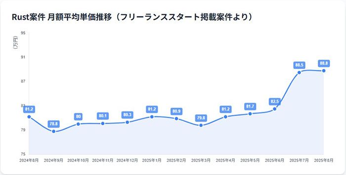 エン・ジャパンが運営する『フリーランススタート』では、サイトに掲載されたすべての求人の情報を集計し、分析を行なっています。今回は、2025年7~8月度の最新調査を基にRust案件の単価動向をまとめました。