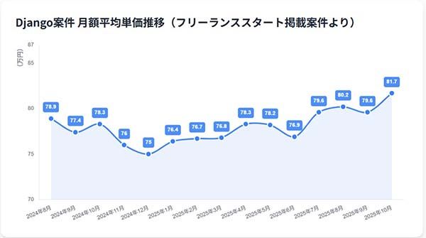 エン・ジャパンが運営する『フリーランススタート』の最新データを基に、2025年7~8月度のDjango案件の単価動向を分析しました。
