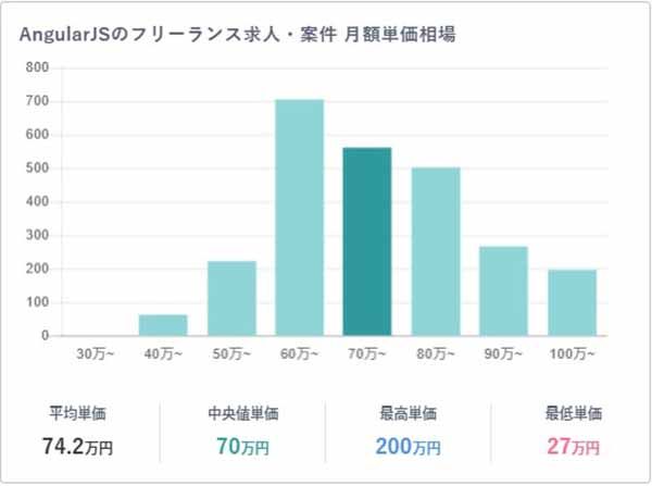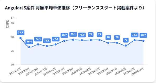 AngularJS案件の月額平均単価は78.7万円です。2022年1月に公式サポートが終了しましたが、既存システムが数多く残存しているため、保守・運用案件を中心に安定した需要が存在します。最高単価は200万円に達し、特に後継のAngular (v2+)への移行経験や、大規模で複雑なシステムの構造を理解し、安全に改修できるスキルを持つエンジニアは、ニッチながらも市場で高い価値を維持しています。