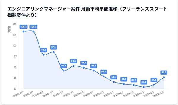 エン・ジャパンが運営する『フリーランススタート』の最新データを基に、2025年9月度のエンジニアリングマネージャー(EM)関連案件の単価動向を分析しました。